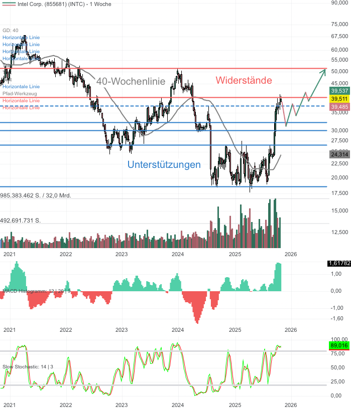 Im Wochenchart sehen wir eine beeindruckende Trendwende der Aktie von Intel (INTC), die von einer Phase der Bodenbildung in einen neuen Aufwärtstrend übergegangen ist. Die Aktie bildete in den Jahren 2024 / 2025 einen Boden aus, welcher durch die Unterstützungszone um 18 USD definiert wird. Seit Mitte 2025 hat sich ein klarer, dynamischer Aufwärtstrend etabliert, der die Notierungen über wichtige Widerstände und die 40-Wochenlinie gehoben hat. Sollte der aktuelle Widerstand bei 40 USD durchbrochen werden, liegt der nächste Zielbereich bei 51 USD. Ein nachhaltiger Ausbruch über diese Zone würde die Bodenbildungsphase endgültig abschließen. Der überkaufte Slow-Stochastik-Indikator zeigt an, dass die Aktie kurzfristig reif für eine Korrektur sein könnte. Ein überkaufter Zustand muss aber nicht zwingend sofort zu einem Kursrückgang führen, sondern signalisiert eine sehr hohe Dynamik.