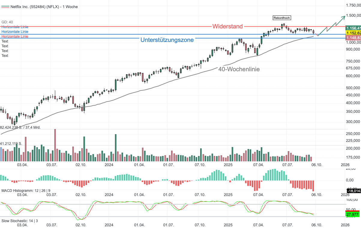 Die Aktie von Netflix (NFXL) hat nach Kritik von Elon Musk zuletzt einen Kursverlust verzeichnet. Dies war zwar kein "Absturz" im klassischen Sinne, doch es bestätigt die technisch anfällige Phase. Längerfristig betrachtet befindet sich die Aktie in einem starken Aufwärtstrend. Der Kurs notiert konstant über der wichtigen 40-Wochenlinie, was den robusten Trend klar bestätigt. Der GD 40 auf Wochenbasis fungiert als dynamische Unterstützung. Eine wichtige Supportzone liegt bei ca. 1.145 bis 1.062 USD. Die Slow Stochastic hat von einem überkauften Niveau gedreht und nähert sich dem überverkauften Bereich an. Der Musk-Kommentar ist primär ein psychologischer Schock für den Kurs. Die tatsächlichen Auswirkungen werden erst im Q4-Bericht sichtbar werden. Kurzfristige Trader könnten die Aktie bei schlechten News abstoßen und der Kurs dadurch wichtige Unterstützungsniveaus testen.
