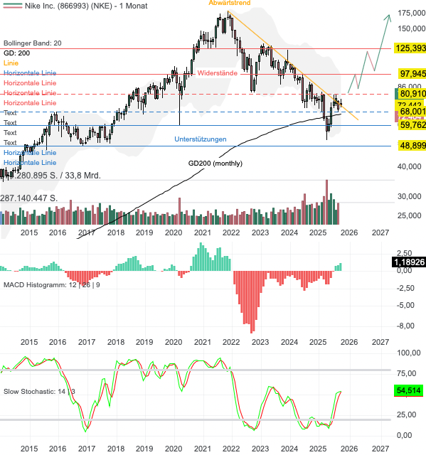 Aus charttechnischer Sicht befindet sich Aktie von Nike seit dem Hoch im Jahr 2021 in einem übergeordneten Abwärtstrend, der durch eine fallende Trendlinie bestätigt wird. Nach einem Rückgang bis zur Unterstützung bei unter 59 USD konnte sich der Kurs zuletzt stabilisieren und testete zuletzt den Widerstand bei 81 USD. Ein nachhaltiger Ausbruch über diese Marke würde ein bullisches Signal liefern und den Weg in Richtung 98 USD freimachen. Im Anschluss befinden sich die nächsten Kursziele bei 125 und 175 USD. Die Unterstützungszonen bei 68 USD und 59 USD dienen als wichtige Absicherungsbereiche. Ein Rückfall unter 59 USD würde das positive Szenario deutlich abschwächen. Das Volumen zeigt in den letzten Monaten eine leichte Belebun. Die Slow Stochastik bewegt sich aktuell aus dem überverkauften Bereich nach oben und unterstützt damit die Chance auf einen Turnaround. Das MACD-Histogramm zeigt erste grüne Balken, was auf eine beginnende positive Dynamik hindeutet.